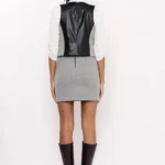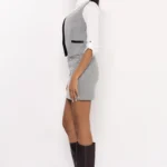 Az AMNESIA Hinsz mellény a modern elegancia újragondolt darabja: elöl klasszikus szövetből készült, hátul pedig műbőr betét adja meg a letisztult, mégis karakteres kontrasztot. A V-kivágás és a karcsúsított fazon optikailag nyújtja a sziluettet, miközben a rövidített hossz tökéletesen kiemeli a derékvonalat.