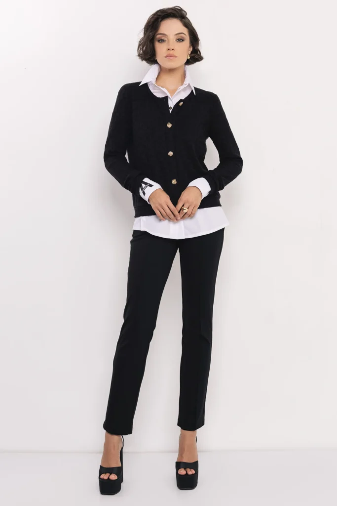 Az AMNESIA Luca kardigán a letisztult elegancia új szintje: fekete, kötött anyaga finom, szinte rejtett leopárd hatású mintával kel életre, amely közelről válik igazán különlegessé. Az arany színű, signature gombok kifinomult részletei tökéletesen emelik ki a darab luxus hangulatát.