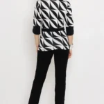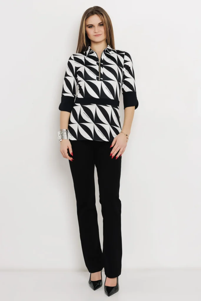 Mintás kimo és vékony punto anyag kombinációjából készült, amely rugalmas és jól tartja a formáját. A cipzáras nyakrész szexin szabályozható, a háromnegyedes ujj praktikus és kényelmes. S és M méretben érhető el, fekete logómintás kivitelben.