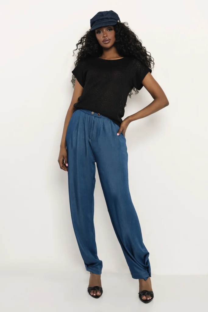 Cérna kötött anyagból készült, amely könnyű, légies és kellemes viselet a melegebb napokon is. A finom textúra és az egyszerű szabás miatt könnyen kombinálható farmerrel, szoknyával vagy elegánsabb nadrággal is. Fekete, ekrü és bézs színekben, egyméretben érhető el.