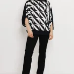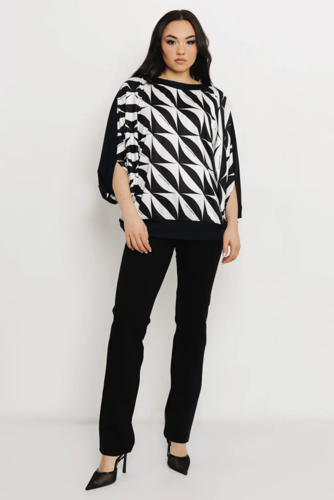 Kimo és vékony punto anyag kombinációjából készült, amely puha tapintású és rugalmas. Az egyméretes, bővebb fazon kényelmesen illeszkedik, az alsó passzés rész pedig keretet ad a sziluettnek.