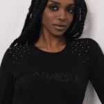 Az AMNESIA Héra szórt köves felső puha, viszkóz anyaga gyönyörűen simul a testre, a vállrész apró strassz díszítése pedig finom, ünnepibb hangulatot kölcsönöz neki. Az arany hímzett AMNESIA logó elegáns részlet, ami kiemeli a darab exkluzív megjelenését.