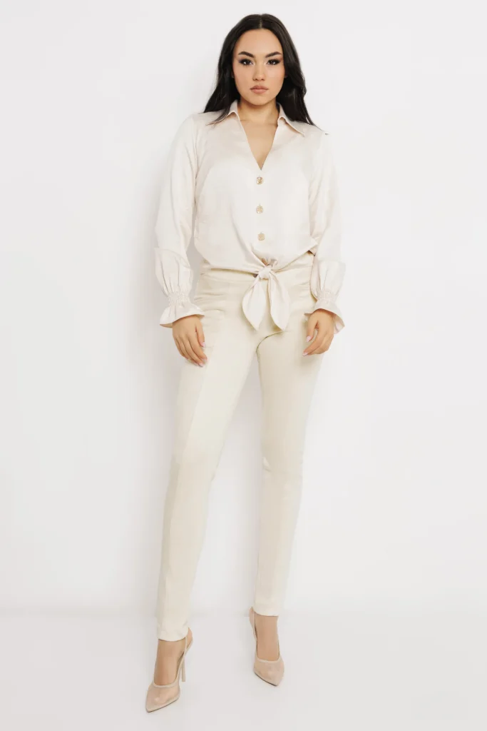 Gyűrt selyem anyagból készül, ami könnyű, lágy esésű és elegáns megjelenést ad. A blúz elején gombsor fut végig, a derekánál megkötős rész szépen formálja az összképet, az ujja pedig gumírozott mandzsettával és finom fodros lezárással készült. S/M és L/XL méretben érhető el, krém és világoskék színben.