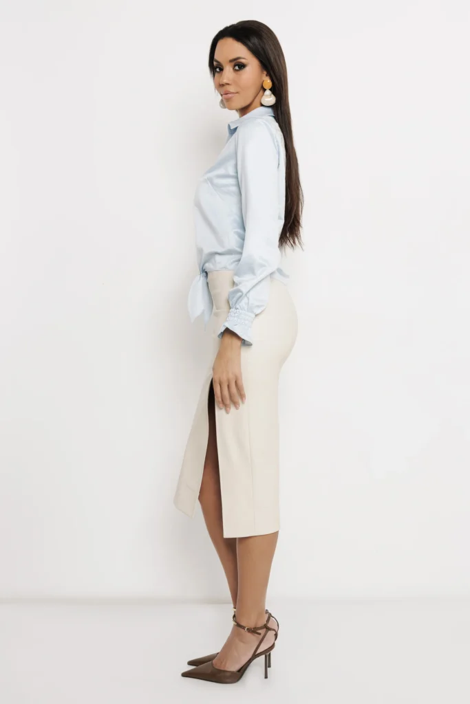 Gyűrt selyem anyagból készül, ami könnyű, lágy esésű és elegáns megjelenést ad. A blúz elején gombsor fut végig, a derekánál megkötős rész szépen formálja az összképet, az ujja pedig gumírozott mandzsettával és finom fodros lezárással készült. S/M és L/XL méretben érhető el, krém és világoskék színben.