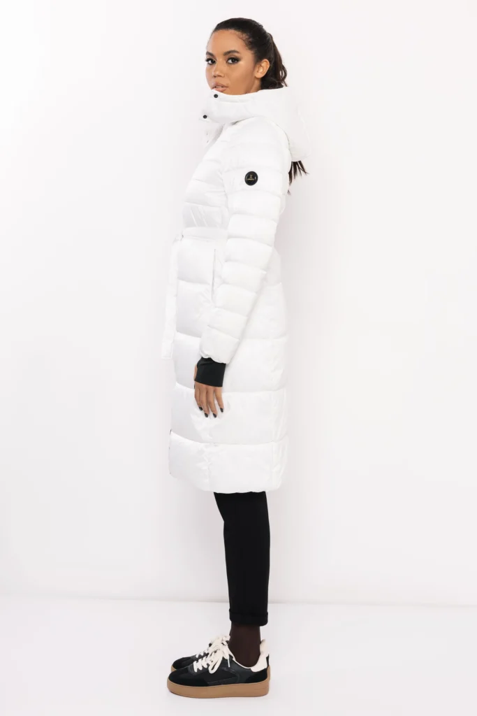 Az AMNESIA Blanka steppelt hosszú kabát a funkcionalitást és a nőies stílust tökéletesen ötvözi. Az öves fazon kiemeli a derekat, miközben a hosszított szabás és a bélelt kapucni maximális meleget biztosít. A cipzár és a finom fényű, steppelt orkán anyag modern, sportos eleganciát kölcsönöz.