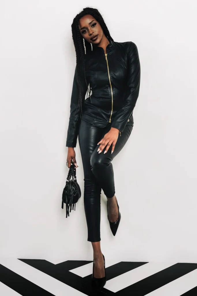 Gyűrt műbőr anyaga elegáns, rugalmas és szépen megtartja a fazont. A szabás karcsúsított, strukturált, S, M, L és XL méretben elérhető, így különböző alkatokra is megfelelő választás.