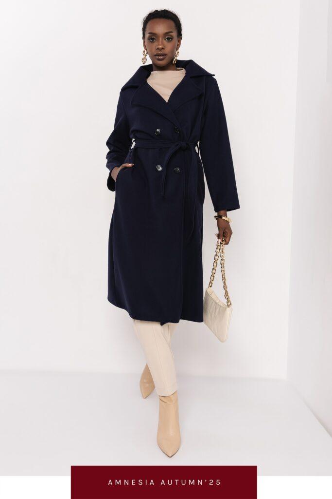Az AMNESIA Poma kabát elegáns, időtálló darab, amely a klasszikus szövetkabát vonalait követi. Egyenes szabása, dupla soros gombolása és széles, sima gallérja letisztult megjelenést kölcsönöz, míg a derékrészen található öv kiemeli a nőies vonalakat. Praktikus hosszának és sokoldalúságának köszönhetően könnyedén kombinálható elegáns vagy hétköznapi szettekhez is.