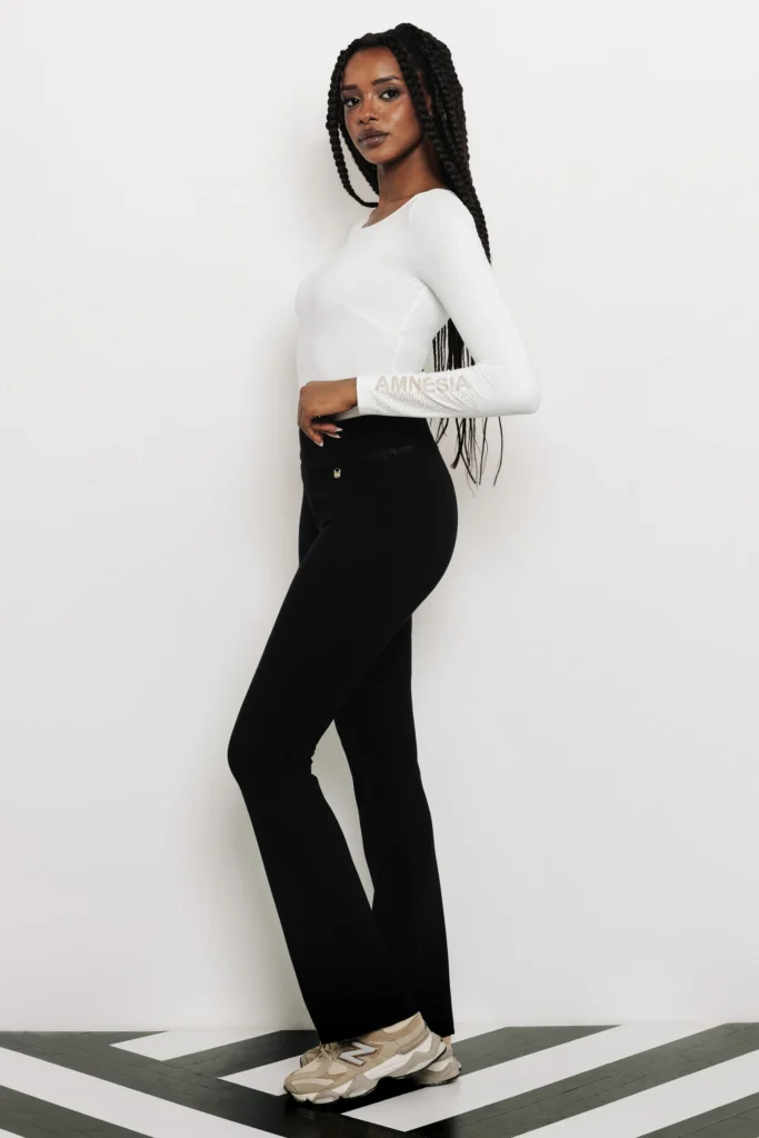 Az AMNESIA Ewgar nadrág letisztult vonalvezetésével és fekete színével alapdarab a tavaszi ruhatárban. Hosszú szára és enyhén bővülő fazonja elegáns hatást kelt, miközben jól illeszkedik a nőies és sportosabb stílusba is. Olyan nadrág, amely elegáns megjelenést ad, és könnyen beépíthető a tudatosan felépített, trendi szettekbe.
