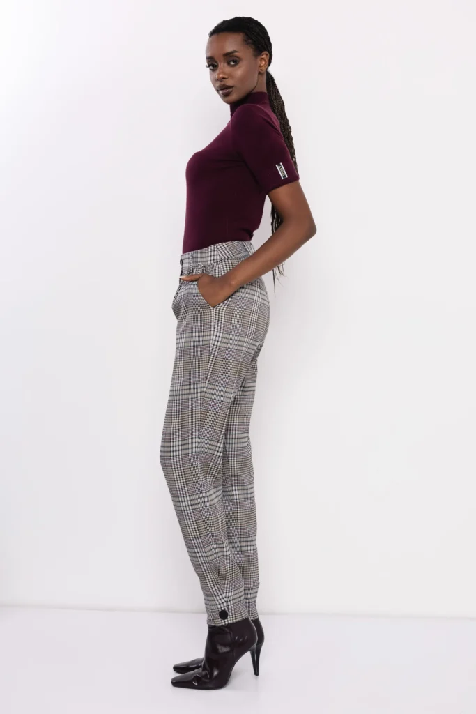 Az AMNESIA Jozefa nadrág a klasszikus kockás mintát modern, nőies szabással ötvözi. Magasított dereka és enyhén szűkülő szára optikailag nyújtja a lábat, miközben a finom hajtott részletek és az oldalzsebek kényelmes viseletet biztosítanak. Az elülső gombos záródás és a szárvégen elhelyezett díszgombok apró, mégis hangsúlyos részletekké válnak, amelyek eleganciát és karaktert adnak a nadrágnak.