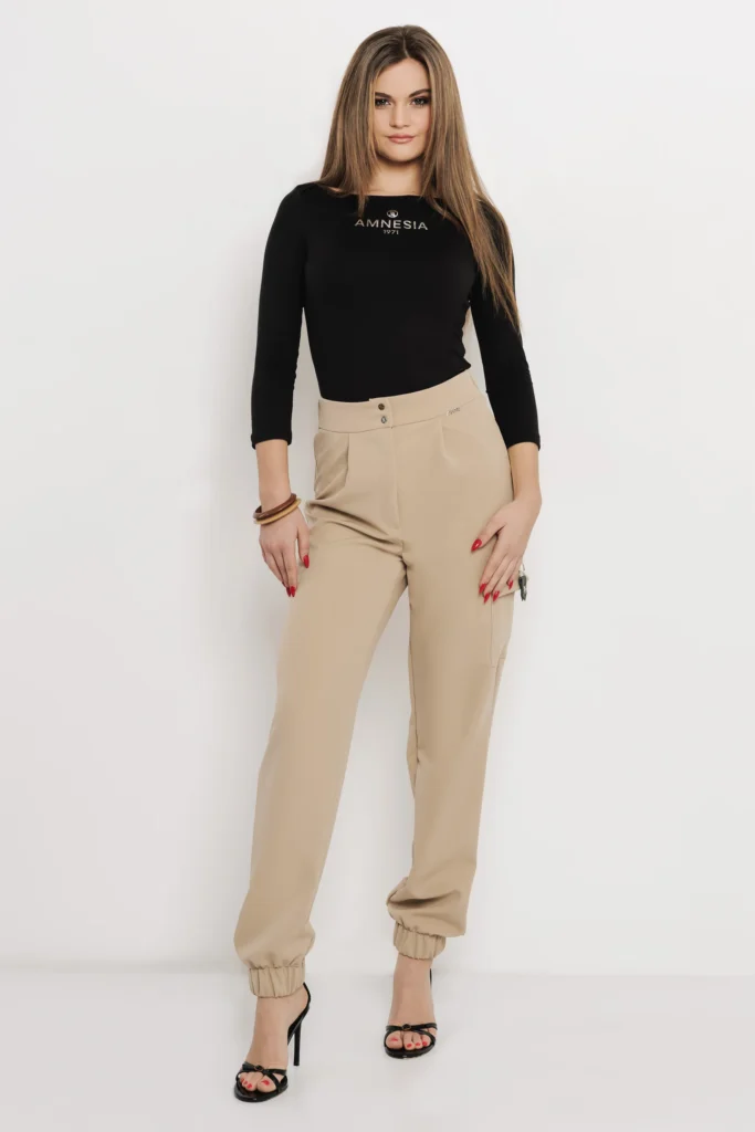 A twist szövet tartást ad a nadrágnak, ugyanakkor kényelmes egész nap. Az alján gumírozott passzé praktikus és jól formálja az összhatást. S-XL méretekben érhető el, fekete és bézs színben.