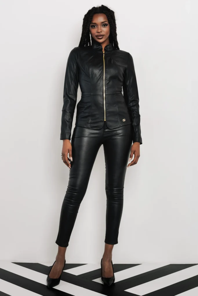 A gyűrt műbőr anyag különleges felületet ad a nadrágnak, miközben megfelelő mozgásteret biztosít viselés közben. A szabás nőies, a derékrész kényelmes, S, M, L és XL méretben érhető el, fekete színben.