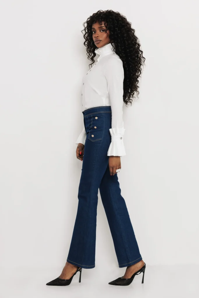 Az AMNESIA Tullia nadrág egy olyan farmer, ami lágyan formálja az alakot és magabiztos megjelenést ad. Magas derekú kialakítása szépen kiemeli a derekat, az enyhén bővülő szár pedig optikailag nyújtja a lábakat. Az arany gombos zsebrészletek különlegessé teszik, miközben a fazon végig letisztult marad.
