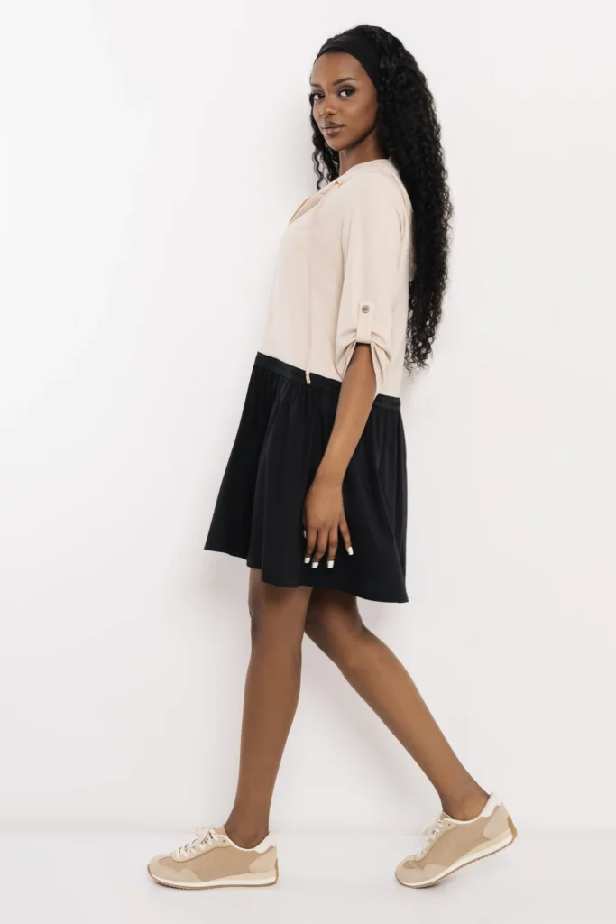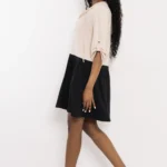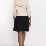 Vékony punto és puplin kombinációjából készült, amely rugalmas és könnyed esésű, így kényelmesen követi a mozgást, miközben szépen tartja a formáját. Fekete-bézs és bézs-ekrü színben érhető el, egyméretben.