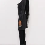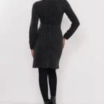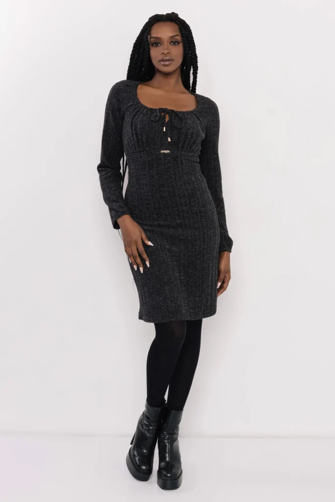 Az AMNESIA Gvenda ruha a nőies eleganciát és a kényelemes viseletet egyesíti. Bordás kötött anyagának köszönhetően rugalmasan követi az alakot, a kerek nyakkivágás és a mellrész megkötős részlete különleges, romantikus megjelenést ad. Hosszú ujja és térdig érő fazonja ideális a hűvösebb napokra, akár magassarkúval, akár csizmával viseled.
