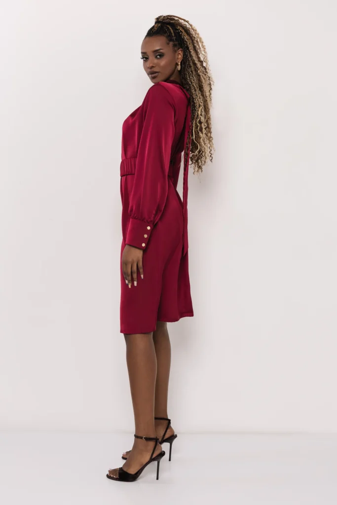 Az AMNESIA Larina ruha azonnal ünnepi hangulatba hoz a finoman fénylő szatén anyagával – egy olyan darab, amihez elég felvenni egy hangsúlyos ékszert, és máris kész a megjelenés.