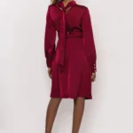 A lágyan omló szatén elegáns fényt ad a ruhának, miközben a magas nyakrész és az apró berakások finoman keretezik az arcot. A rugalmas derékrész szépen formáz, a hosszú ujj pedig könnyed, nőies vonalat visz a fazonba.