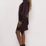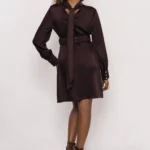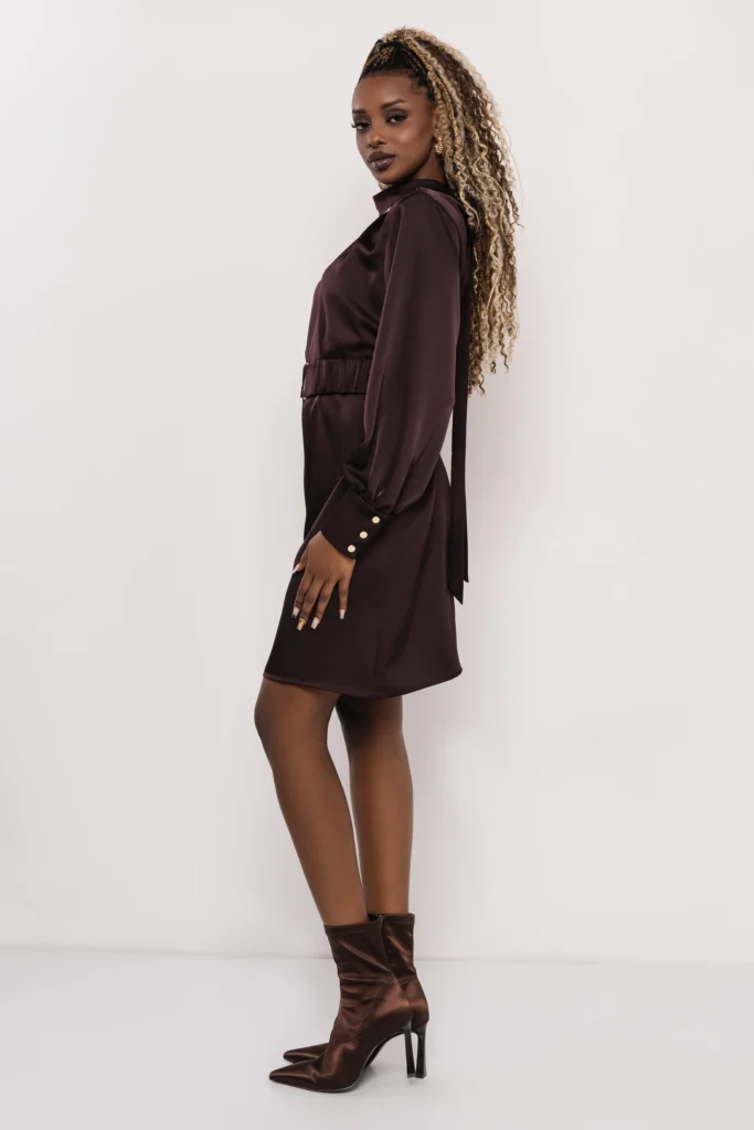 A lágyan omló szatén elegáns fényt ad a ruhának, miközben a magas nyakrész és az apró berakások finoman keretezik az arcot. A rugalmas derékrész szépen formáz, a hosszú ujj pedig könnyed, nőies vonalat visz a fazonba.