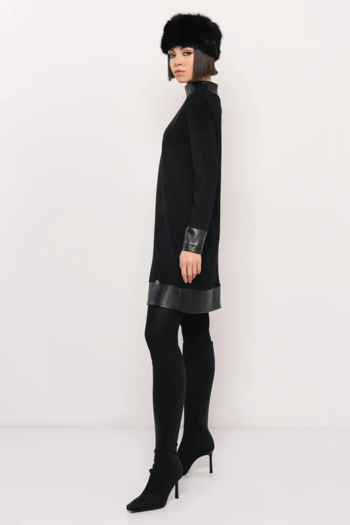 A punto alap kényelmes és rugalmas, amit jól kiegészítenek a műbőr betétek. Ezek együtt adják a ruha modern jellegét, miközben a fazon nőies és letisztult. Fekete színben érkezik, ami minden alkalomra elegáns választás.