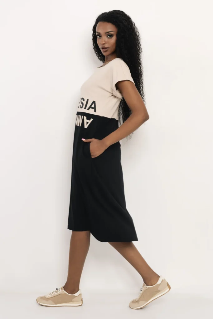 Az AMNESIA Noni ruha egy letisztult, modern darab, amely a minimál stílust egy különleges színblokkolással teszi izgalmassá. A lazább szabás és az aszimmetrikus vonalvezetés friss, könnyed megjelenést ad.