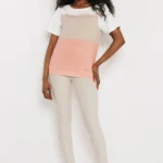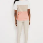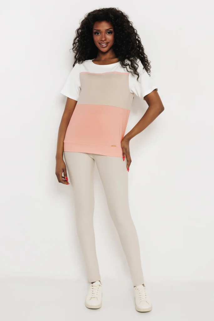 Az AMNESIA Zeti felső egy friss, színblokkolt darab, amely játékosan ötvözi az ekrü, barack és bézs árnyalatokat. A letisztult, enyhén bővebb fazon kényelmes viselet, a rövid ujj pedig könnyed, nyári hangulatot ad.