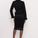 A fazon ceruzaszoknya-szabású, ami szépen követi az alakot, a csipke hullámos szegélye pedig romantikus részletként zárja a sziluettet.